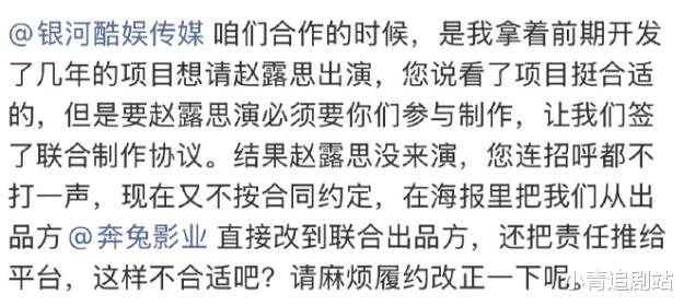 现在的主制作方是银河酷娱,结果张芷溪这一方,在出品栏那一栏,变成联合出品方,还推给平台,要求对方履行合约。还激烈喊话,法院见。