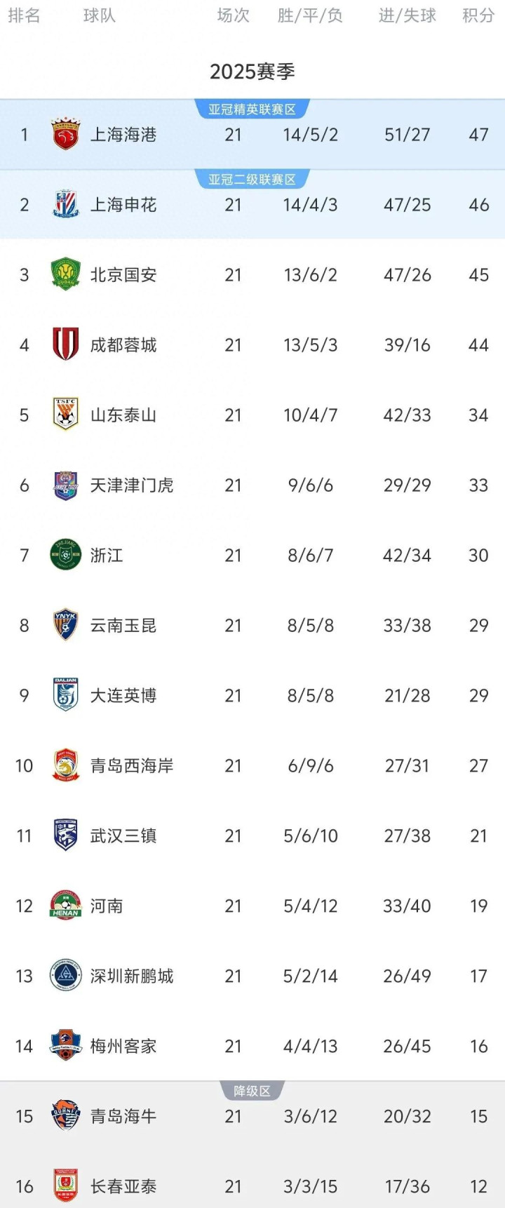 本周末,中超第21轮比赛已经结束了全部8场比赛的争夺。随着上海申花客场被浙江队逼平,而海港主场再次发力横扫河南而全取3分。这样在积分榜上海港反超申花以47分登上积分榜首位,而本轮收获平局的申花以1分之差退居次席。不过紧随其后的国安和蓉城同样保持着对冠军的有力争夺。国安本轮客场战胜青岛西海岸后积分达到45分,已经反超蓉城跃居到第3位。而本轮主场意外被青岛海牛逼平的成都蓉城积44分退居第4。