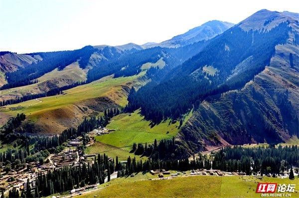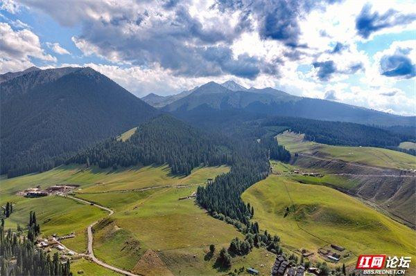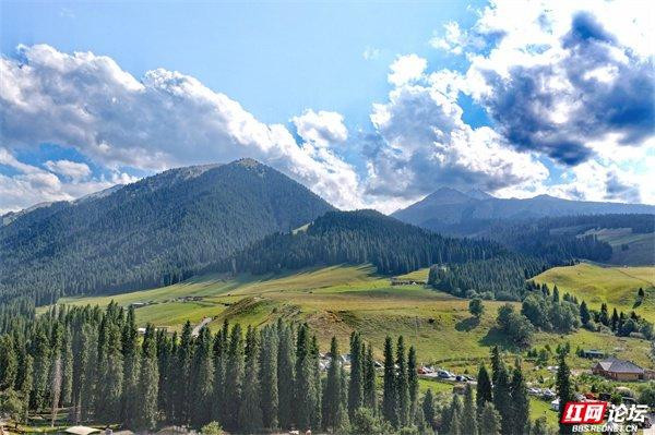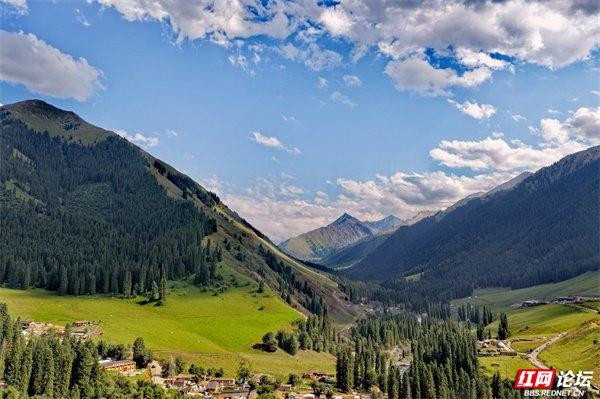 在新疆特克斯县琼库什台村,大自然肆意泼洒着色彩与诗意。澄澈湖泊如宝石镶嵌在大地,河流似银带蜿蜒于山谷间,滋养出葱郁森林与广袤草原。这里,山峦层叠,云影悠悠,村落与毡房点缀在绿意之中,羊群如珍珠散落草野。每一处风景,都是天地绘就的绝美画卷,诉说着新疆大地的雄浑与灵秀,邀你共赴这场视觉与心灵的盛宴。(图文/杨勇)