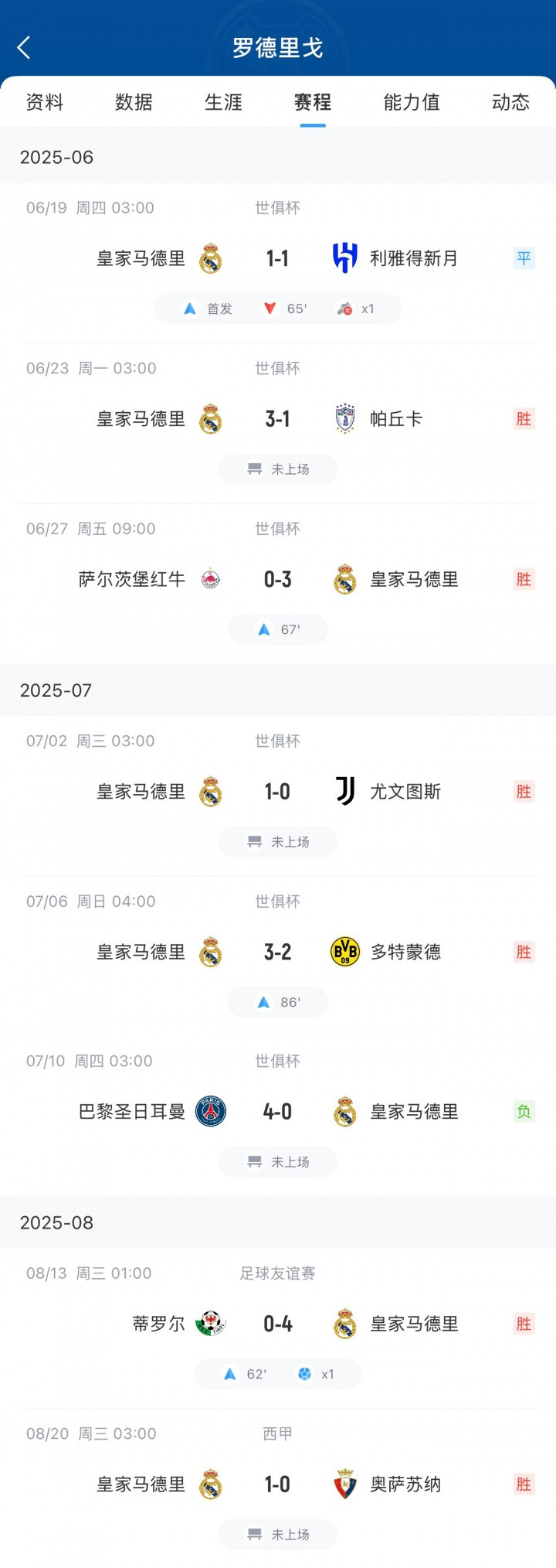 哈维-阿隆索上任后率领皇马出战7场正式比赛,罗德里戈仅在第一场首发65分钟,随后6场均替补,在这6场中也仅出场2次,共计28分钟。