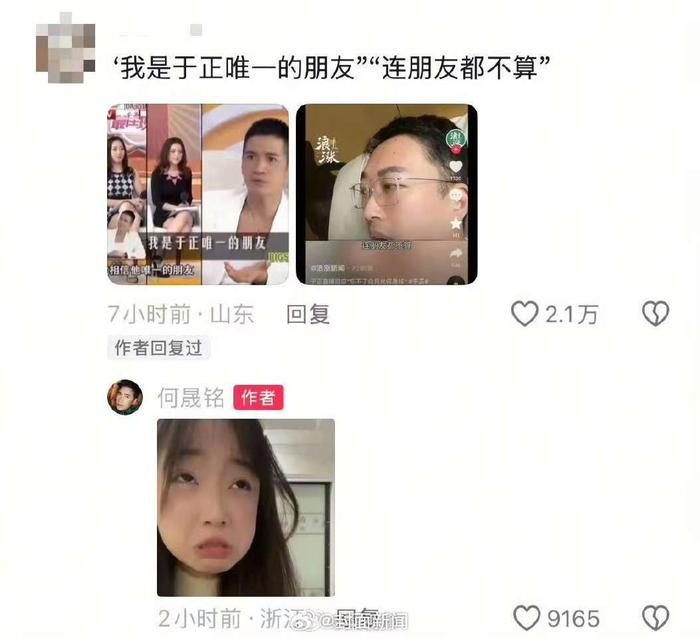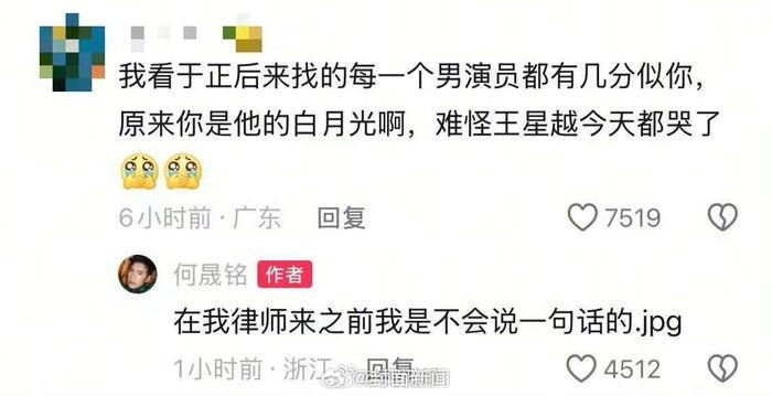 [何晟铭于正连朋友都不算?#何晟铭回应了又像没回应#]#何晟铭也急了#8月23日,网友在评论区留言:“我看于正后来找的每一个男演员都有几分似你,原来你是他的白月光啊。”何晟铭回复:“在我律师来之前我是不会说一句话的。”对于于正“连朋友都不算”的表态,何晟铭回复了一个表情包。