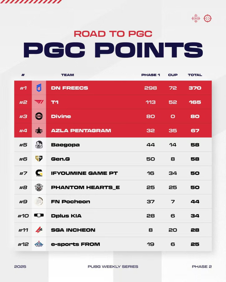 如果韩国PGCPOINTS排名前4位的队伍中,有一支队伍凭借PGSPOINTS获得PGC参赛资格,则排名其后的韩国队伍将参加PGC2025。