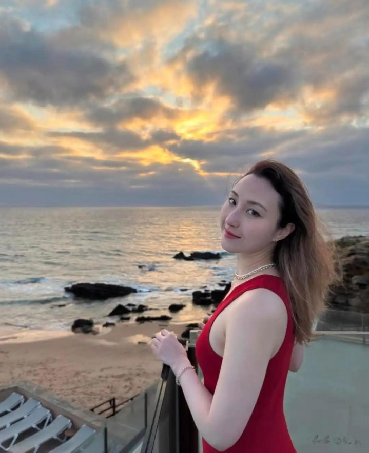 有张在海边拍的,晨光洒在海面上泛着金光,她穿一袭红色长裙站在岸边,回眸一笑时,长发被海风轻轻吹起,颈间的珍珠项链衬得皮肤愈发白皙,腰线收得恰到好处,窈窕身段一览无余,网友直呼 “这才是‘肤白貌美’的正确打开方式”。