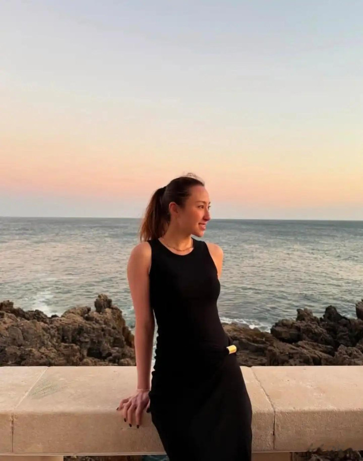 还有张穿小黑裙的,她背对着大海坐在石凳上,侧脸线条柔和,嘴角带着浅浅的笑意望向远方,安静又温柔,连阳光落在她身上都像加了滤镜。