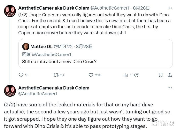 据知名舅舅党Dusk Golem爆料,卡普空曾经两次尝试重启《恐龙危机》系列,都以失败告终。