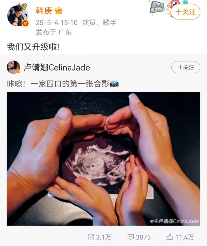 今年5月4日,韩庚就官宣了妻子怀二胎的消息。他转发了二胎B超照片,并表示“我们又升级啦!”