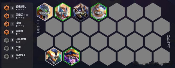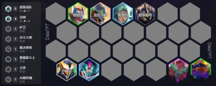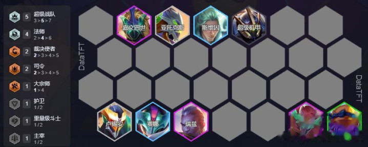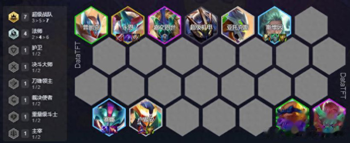 阵容构成由7位超级战斗棋子+另外两位法师棋子组成,9人口成型阵容,看上去需要的装备非常多对不对?实际上这套阵容的主C兼主坦都是超级机甲,其余的副C副坦有多余装备就养,没有就不养,非常简单,副C的选择有永恩卡尔玛,副坦的选择有皇子乌鸦,乌鸦后期可以换格温
