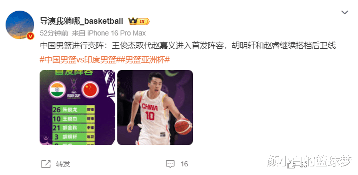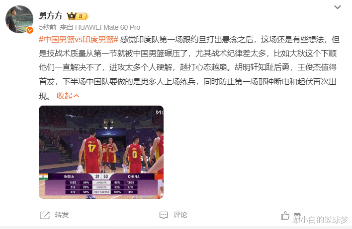 记者勇方方:感觉印度队第一场跟约旦打出悬念之后,这场还是有些想法,但是技战术质量从第一节就被中国男篮碾压了,尤其战术纪律差太多,比如大秋这个下顺他们一直解决不了,进攻太多个人硬解,越打心态越崩。胡明轩知耻后勇,王俊杰值得首发,下半场中国队要做的是更多人上场练兵,同时防止第一场那种断电和起伏再次出现。
