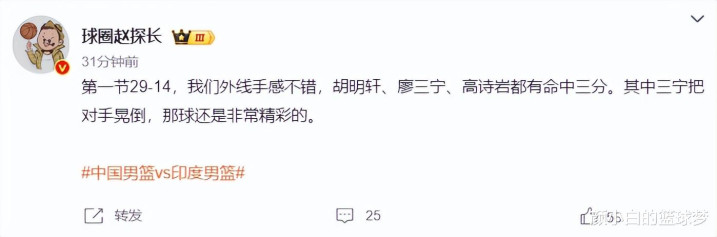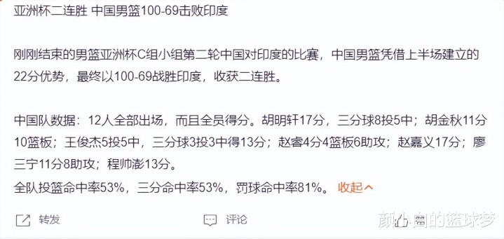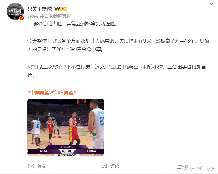 博主:今天整体上男篮各个方面都挺让人满意的,失误控制在9次,篮板赢了对手18个。更惊人的是投出了28中15的三分命中率。
