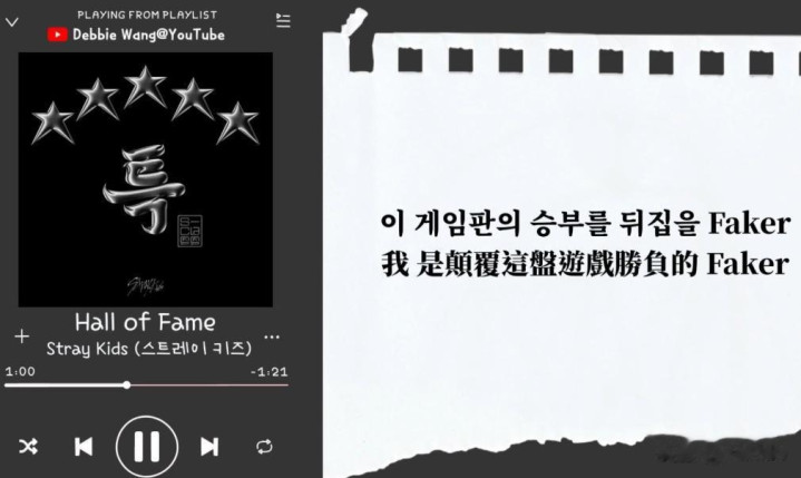 Stray Kids一直以来都与许多明星合作过,而这次终于有机会与自己的偶像一起合作拍摄MV。对于Stray Kids的成员来说,这可能也是一次梦想成真的机会,能与自己的偶像合作。据悉,Stray Kids全员都是Faker的粉丝,尤其是成员方灿还会在巡演的空闲时间观看Faker的比赛直播。他们此前还将Faker写进了《Hall of Fame》的歌词中,歌词大意是“我是颠覆这局游戏胜负的Faker”!