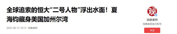 观察者网2025-08-15——全球追索的恒大“二号人物”浮出水面!夏海钧藏身美国加州尔湾