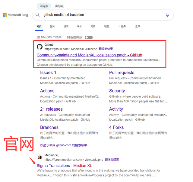 在浏览器搜索“github median xl traslation”。这里建议使用微软的“Bing”搜索引擎,用百度之类的搜索,会出现一堆无关内容,无法精准定位。通常情况下,Bing搜索出来的第一个github结果,就是我们要找的东西。