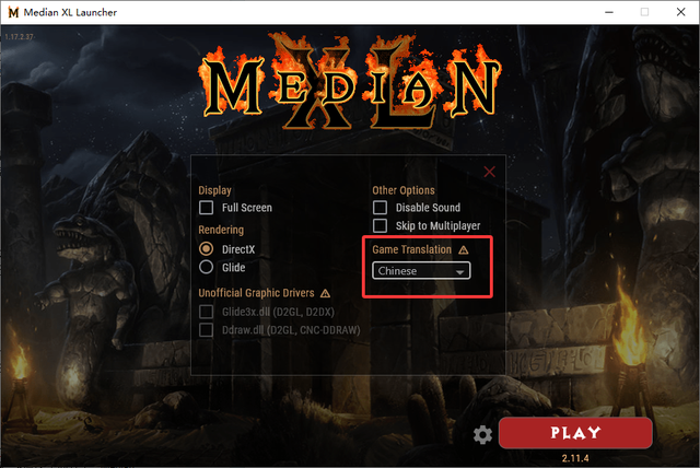 接下来是汉化补丁安装。解压刚才下载的压缩包,获得一个“lang-zh.mpq”的文件。复制它,进入《暗黑破坏神2》的安装目录,找到并进入“median-xl”目录,粘贴。桌面双击“Median XL”图标,点击弹出窗口右下角的“齿轮”按钮,在弹出的新窗口右下角“Game Traslation”下拉列表,选中“Chinese”。