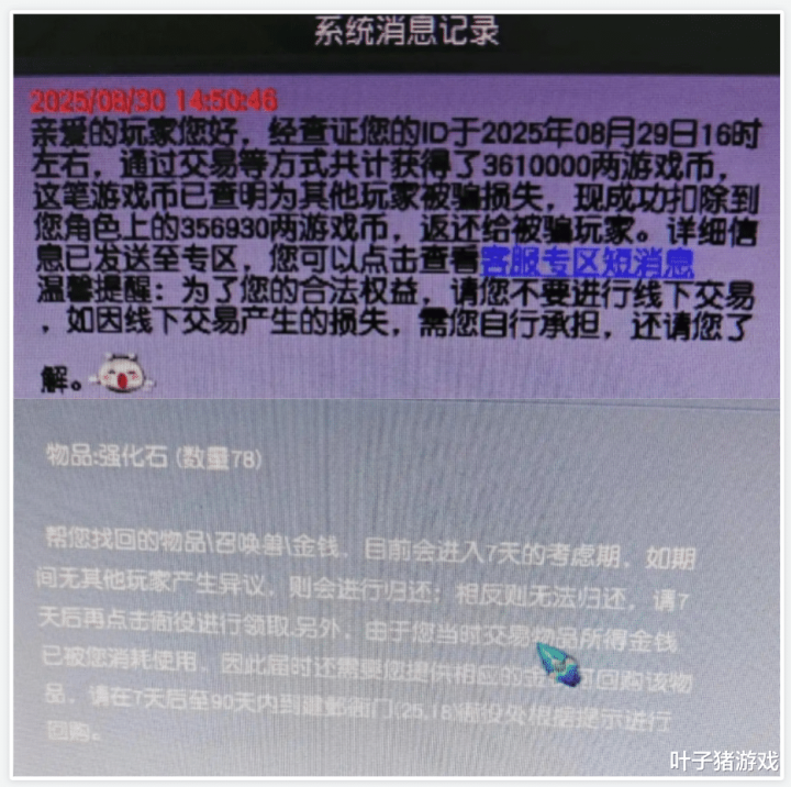 为了挽回损失,这位小伙伴果断前往客服专区。在客服的协调下,这位玩家虽然会被扣除了361W梦幻币,但也归还了78块强化石,也算是挽回了损失。不知道各位小伙伴有没有遇见过这类事情呢?