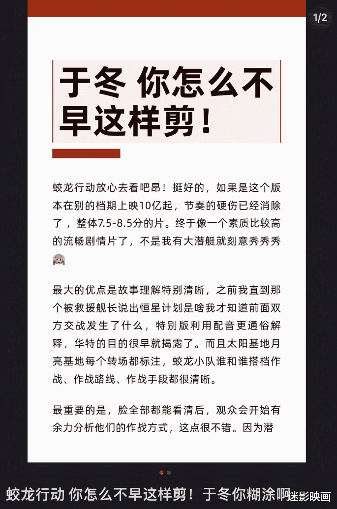 以前总听网友说“于冬这人能处”,说实话我当时还不太信。毕竟电影圈里嘴上说“尊重观众”的人多了去了,真正做到的有几个?但这次看完《蛟龙行动(特别版)》,我是真信了。