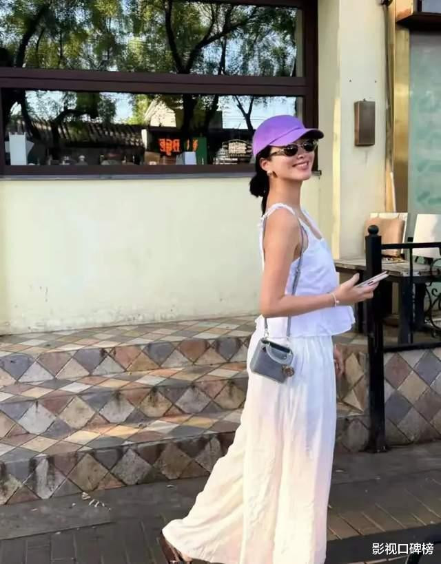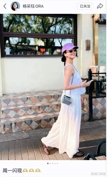 前几天,杨采钰在社交台分享了多张美照。穿着白色吊带下搭白色宽裤,戴着紫色的棒球帽,背着名牌包包。
