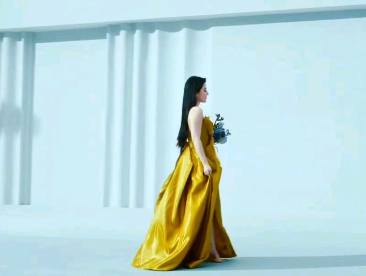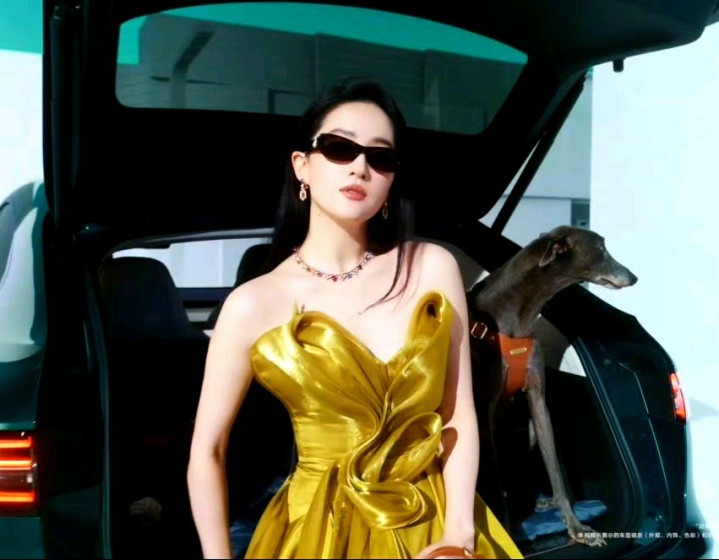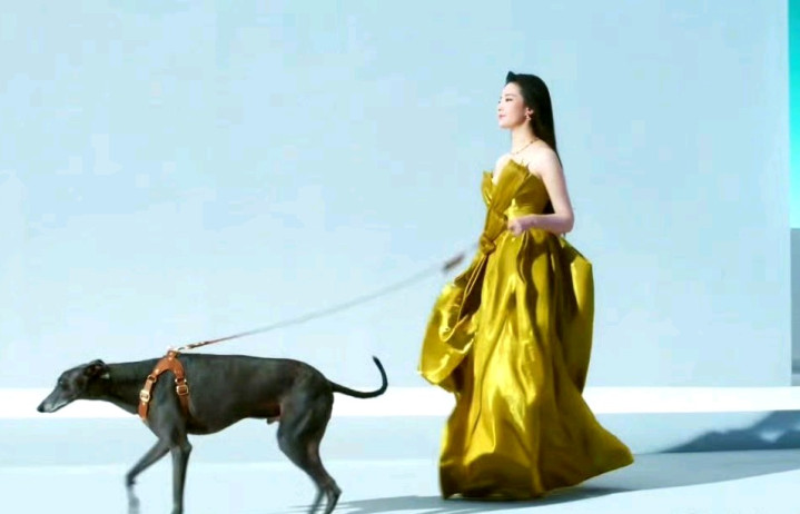 刘亦菲身着一袭璀璨金黄色衣装,衣上暗纹精美,与她优雅气质相得益彰。她温柔牵着身旁的狗狗,人与宠物互动间尽显灵动。