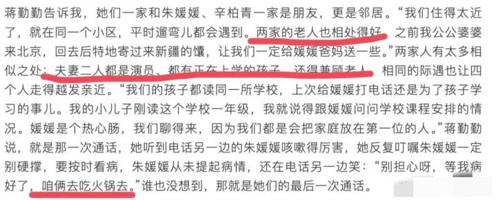 蒋勤勤在朱媛媛去世后,也没有见过辛柏青,只和朱媛媛的父母联系过,还是因为蒋勤勤的父母给朱媛媛的父母从新疆寄了特产,朱媛媛的父母发消息感谢蒋勤勤。