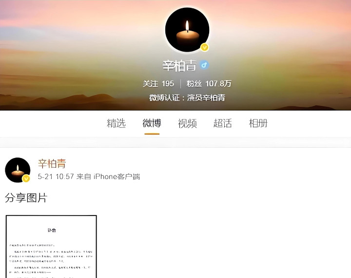 而辛柏青最新的一条微博还是5月21日发布的朱媛媛的讣告。