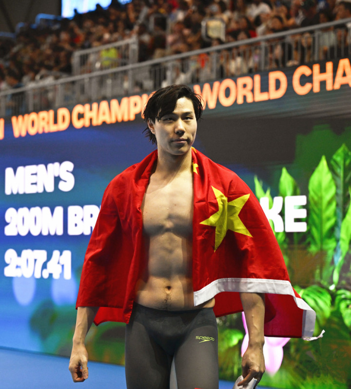 当覃海洋站在领奖台上,脖子上已挂满本届世锦赛的第四枚奖牌:除200蛙金牌外,他还斩获100米蛙泳金牌、50米蛙泳铜牌,并与队友携手摘得男女混合4×100米混合泳接力银牌,而更令人震撼的是他两年来的统治级表现,近两届世锦赛六项蛙泳决赛豪取五枚金牌,铸就了新一代“蛙王”的传奇,美国专业游泳媒体《swim swam》惊叹:“他就是蛙泳界的菲尔普斯!看看那手臂肌肉,简直是为游泳而生的怪物”