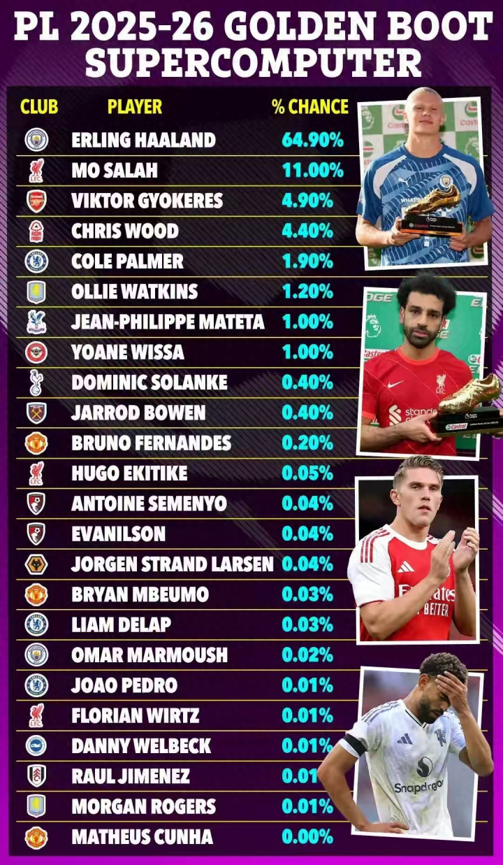超级计算机CasinoHawks近日闲着没事,于是乎预测了2025-26赛季的英超金靴得主,结果曼城的硬仗软脚虾哈兰德遥遥领先,上赛季的英超金靴萨拉赫排名第二,阿森纳新援、最近2个赛季葡超金靴约克雷斯排名第三,而上赛季的英超银靴伊萨克直接消失了……