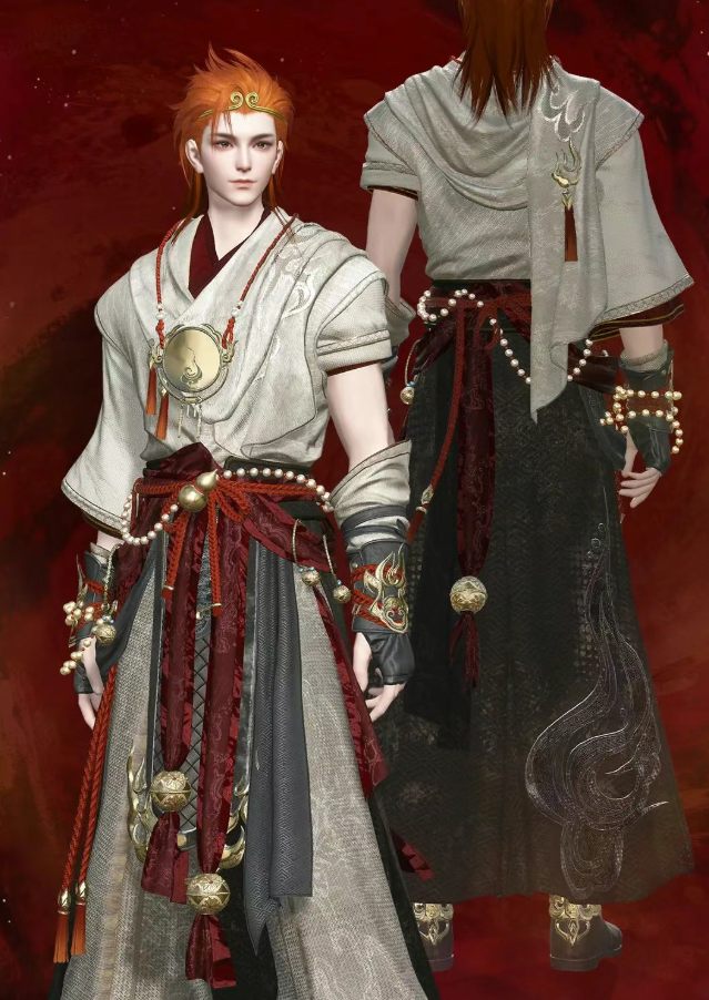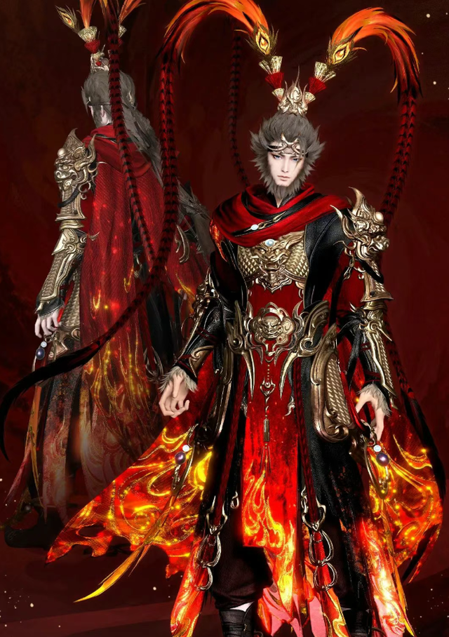 男款时装以齐天大圣孙悟空为设计核心,将其桀骜不驯的性格与无所畏惧的英雄气魄演绎得淋漓尽致!时装整体以黑、红、金三色为主,象征着力量、热血与荣耀。金丝绣制的火焰纹路如同炽热的熔岩,从战袍底部蔓延至肩膀,仿佛随时准备席卷天地,燃尽一切。头顶的凤翅紫金冠更是点睛之笔,象征着大圣的不凡与尊贵,金色光泽在阳光下熠熠生辉。