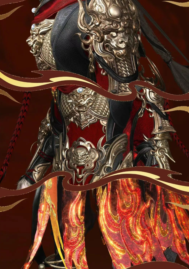 赤焰披风随风而动,仿佛大圣腾云驾雾时的浩然之气,散发出无可匹敌的威严。金色铠甲上的兽首浮雕象征着驱邪除魔、战无不胜的信念。铠甲线条流畅,充满力量感,每一处细节都透露出大圣的刚强与不羁。踏碎凌霄,霸气十足!