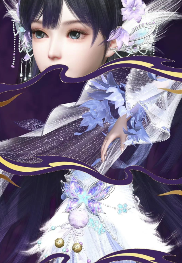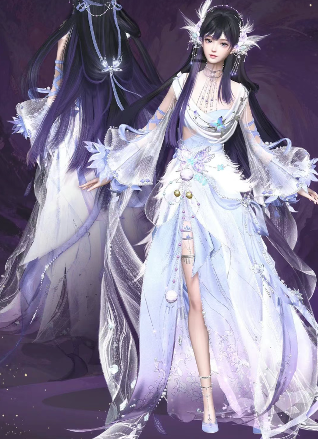 发尾的紫色渐变与裙身颜色相呼应,裙身珍珠点缀与左侧裙衩的巧妙剪裁,使整体造型既优雅浪漫,又不失活泼灵动。袖口如兰瓣绽放,外层薄纱上装点立体紫兰堆花,举手投足间仿佛花瓣随风舞动,将紫兰仙子的飘逸与温柔展现得淋漓尽致!