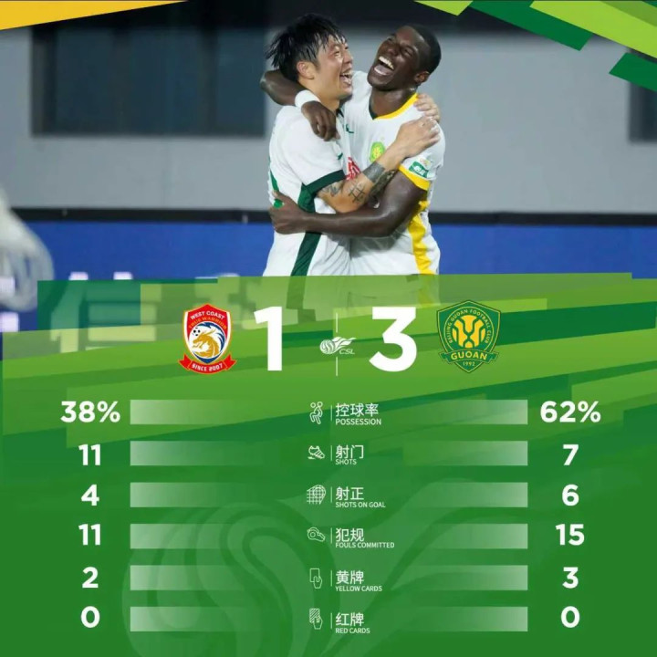 最终,北京国安客场3-1战胜青岛西海岸。