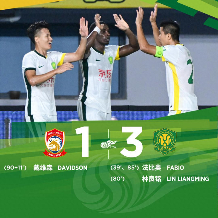 战报 | 法比奥梅开二度 林良铭破门 北京国安 3-1 青岛西海岸