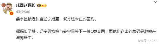 北京时间8月20日,根据媒体人赵探长报道,辽宁男篮将与姜宇星签下一份C类合同,而他们送出的筹码是赵率舟与刘雁宇。
