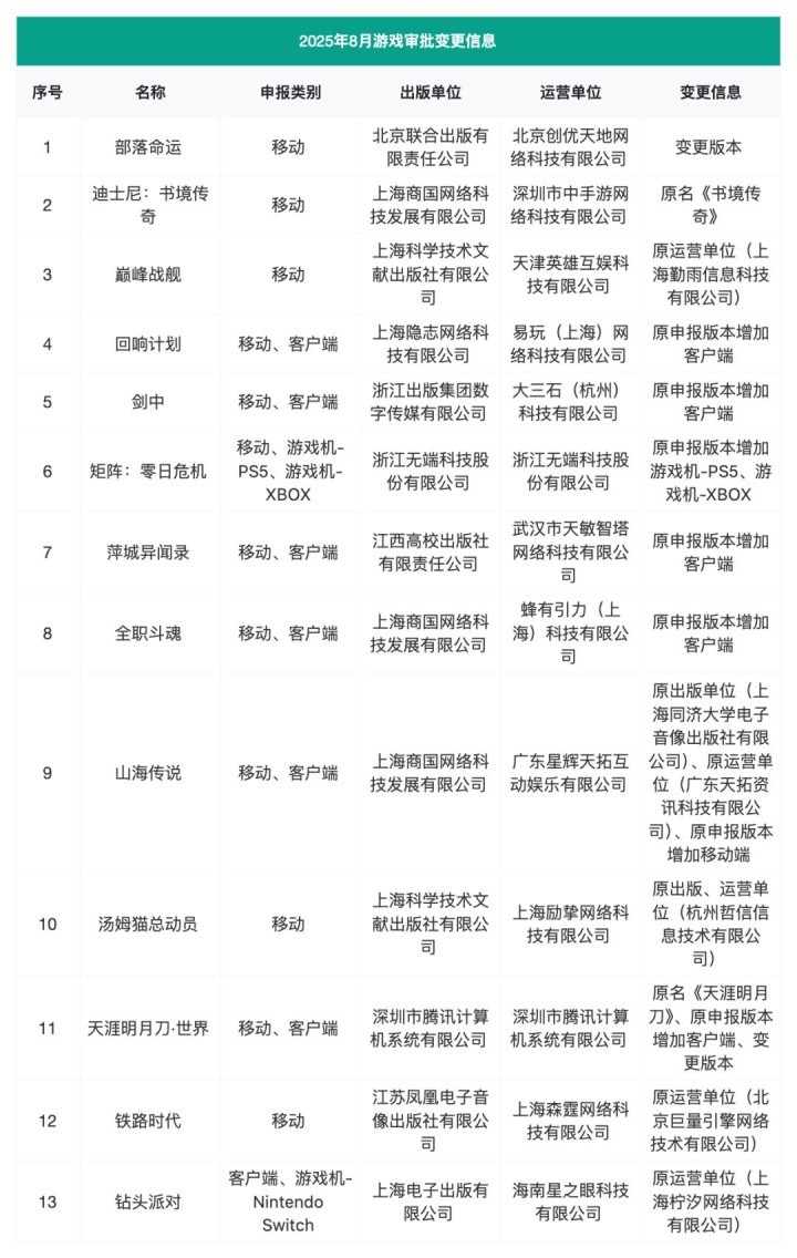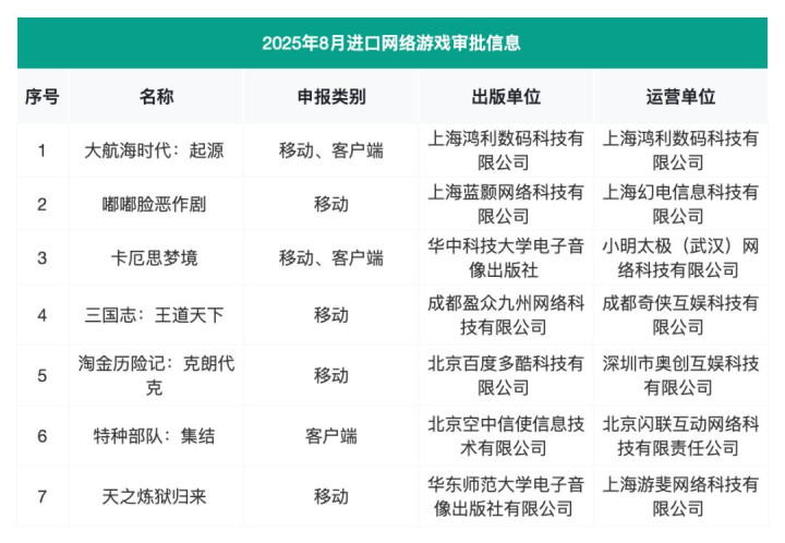 今天(8月25日),国家新闻出版署发布了《2025年8月份国产网络游戏审批信息》。