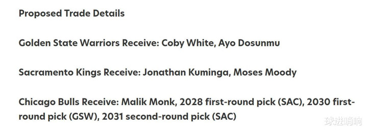 公牛得到:蒙克+28年国王首轮+30年勇士首轮+31年国王次轮。