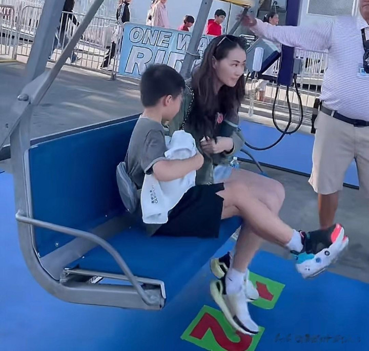 让孩子们体验了大滑梯,一家人又去尝试坐缆车,李安琪带着儿子,弟弟年龄小还很粘着妈妈,李安琪一坐下就拉着儿子,母爱满满。
