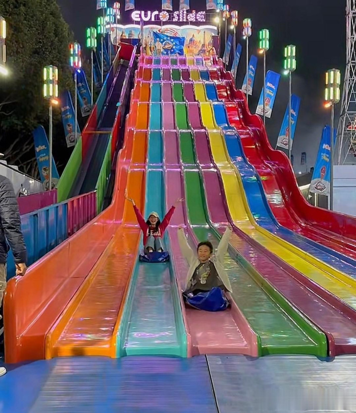 奥莉陪着弟弟玩超长滑梯,姐弟俩滑到地面上都特别激动举着手臂欢呼,满屏都是欢乐的气息。