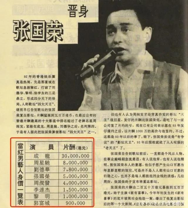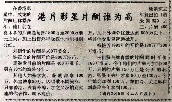 其中多个报道写明,当红明星中能过千万的只有成龙、李连杰、周星驰三人,接下来则是周润发的400万加分红,刘德华的100万美金,张国荣的400万,张学友、黎明、郭富城、梁朝伟等人则维持在100万以内。