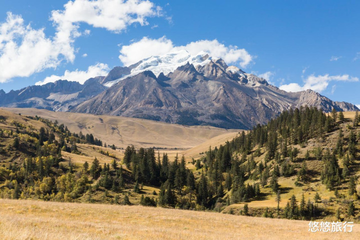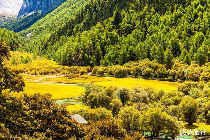 格聂海拔较高,秋色来得早一些。雪山皑皑,草原金黄,九月底层林尽染。